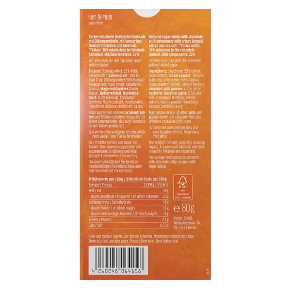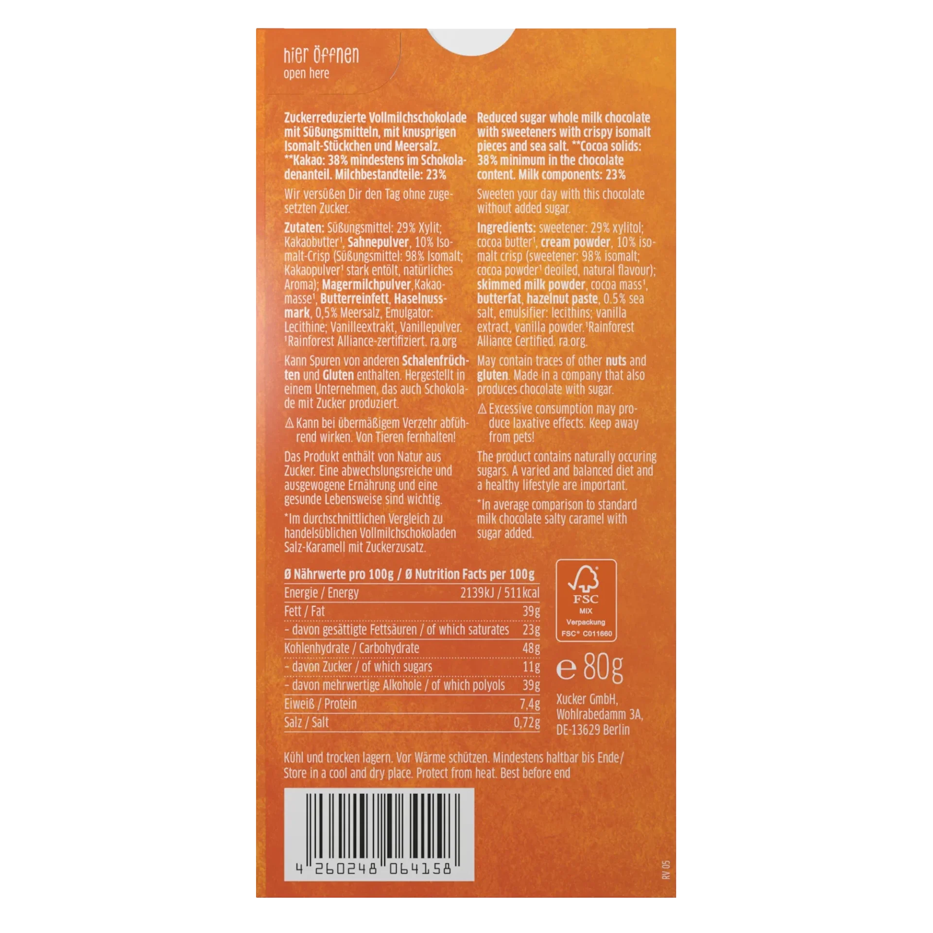 Ingredienten: Zoetstof: xylitol (29,3%), cacaoboter, roompoeder (11,5%), isomalt crisp (10%) (zoetstof: isomalt (98%); cacaopoeder ontolied, natuurlijk aroma); magere melkpoeder (9%), cacaomassa, botervet, hazelnootpasta, zeezout (0,5%), emulgator: lecithine (zonnebloem); gemalen vanillestokjes, natuurlijk vanille aroma.