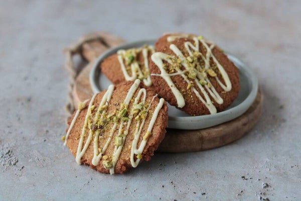 Ingrediënten: Amandelmeel, erythritol, xylitol witte chocolate drops, vanille-extract, wijnsteenbakpoeder, baking soda, pistachenoten, baking soda, roomboter, ei.