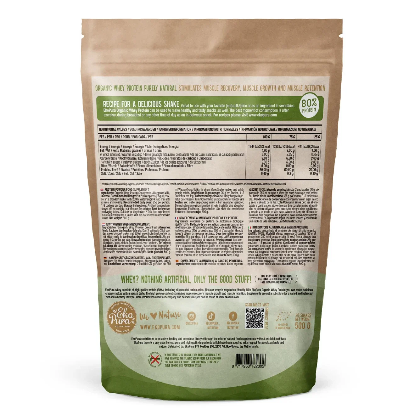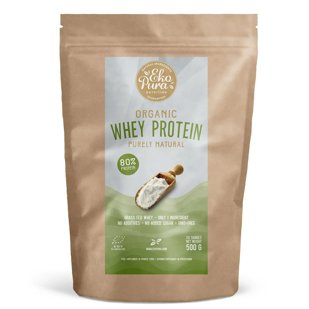Ekopura Whey Protein is puur natuur, bevordert het immuunsysteem, bevat alle essentiële aminozuren en zit boordevol antioxidanten. Het is afkomstig van Europese, grasgevoerde koeien die een goed leven hebben. Ze spenderen hun tijd vrij grazend in de buitenlucht. Alleen als het te koud wordt gaan ze naar binnen waar ze in ruime stallen verblijven.
